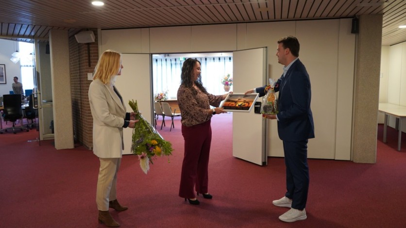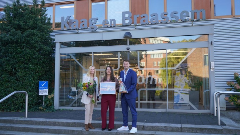Brittney kreeg haar foto als ingelijst examplaar overhandigd door wethouder Nick van Egmond en Judith Lemmers van Stichting Kaag en Braassem Promotie. Ook kreeg ze een borrelpakket en een bos bloemen mee naar huis.