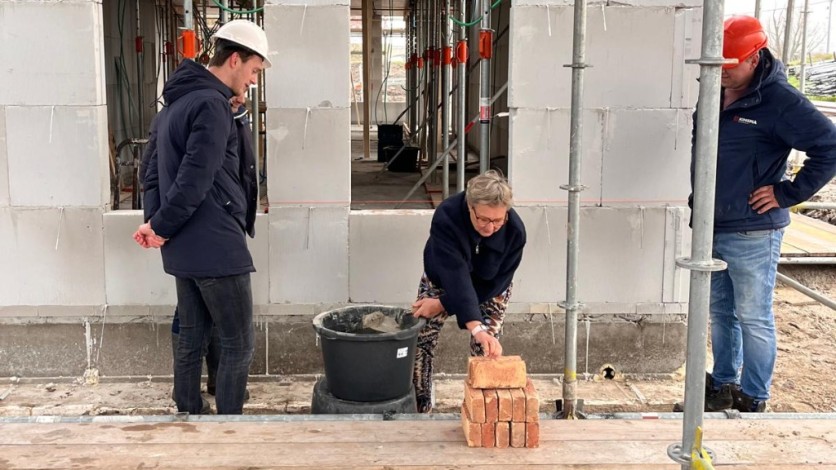 Wethouder Yvonne Peters geeft startsein voor bouw Het Westeinderhuis door middel van symbolische eerste steen